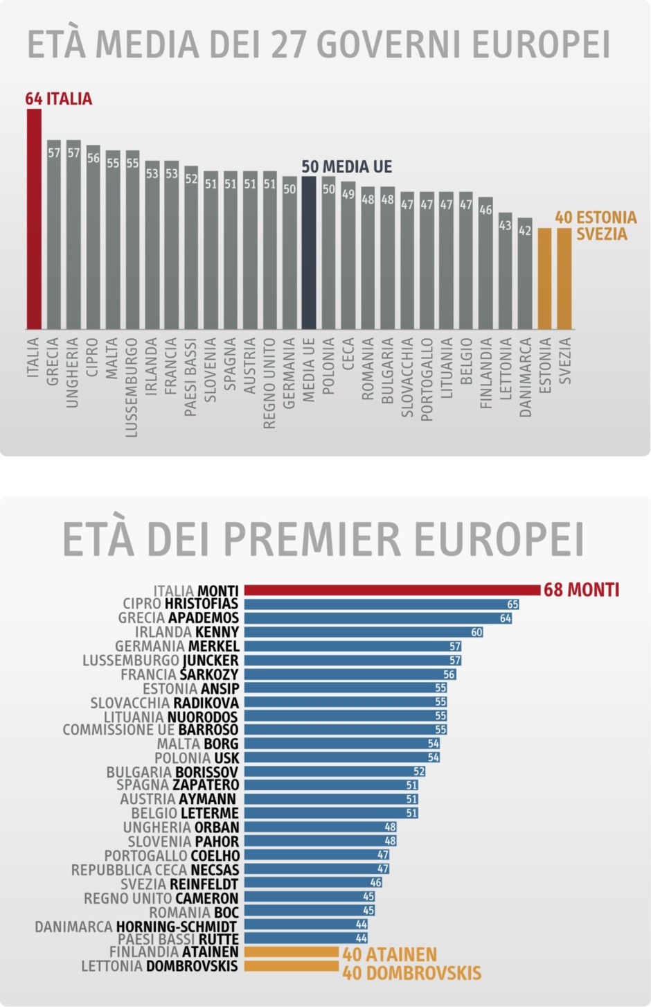 Se per qualcuno il governo Monti è il governo del “grande vecchio” che minaccioso si aggira per l’Europa, possiamo dire che in realtà è il più vecchio dei governi europei e il più anziano anagraficamente di tutti i 58 governi della storia repubblicana. L’esecutivo guidato dall’ex commissario europeo, con i suoi 64 anni di età media è il più anziano d’Europa, così come lo stesso Mario Monti è il capo di governo con l’età più alta (68 anni) di tutta Europa. Giusto per citare qualche esempio, sono più giovani del Presidente del Consiglio italiano, Nicolas Sarkozy (56 anni), Angela Merkel (57 anni) e il premier inglese David Cameron con i suoi 45 anni.